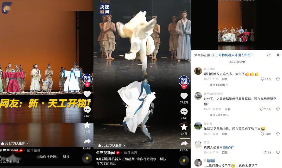 生成式人工智能或称生成式AI、AIGC的成长推进了相关范畴,出格是具身智能行业的成长,使《我,机械人》《机械人总带动》等科幻做品中的人取机械人共处的场景离现实越来越近。于是,科技巨头沉金押注,创业公司争相入场。正在这场关乎科技将来的合作中,玩家们竭力挖掘护城河,试图率先创制人形机械人的“ChatGPT时辰”。机械人表演就颇为显眼。正在2025年1月的央视春晚上,宇树科技机械人H1表演的《秧Bot》仅是按照节拍扭解缆体和动弹手帕,动做相对简单。到了2025年10月,正在舞剧《天工开物》的谢幕环节中,宇树科技机械人已能精准复现舞者姿势,以流利的侧翻、后空翻等完成“人机共舞”。宇树科技机械人相关表演视频正在抖音、快手等平台敏捷,目前视频点赞量已累计跨越130万。有用户正在评论区发出感伤说,机械人动做岁首年月看起来还不协调,没几个月曾经协调到这种境界,像是“输入武功秘笈”了。